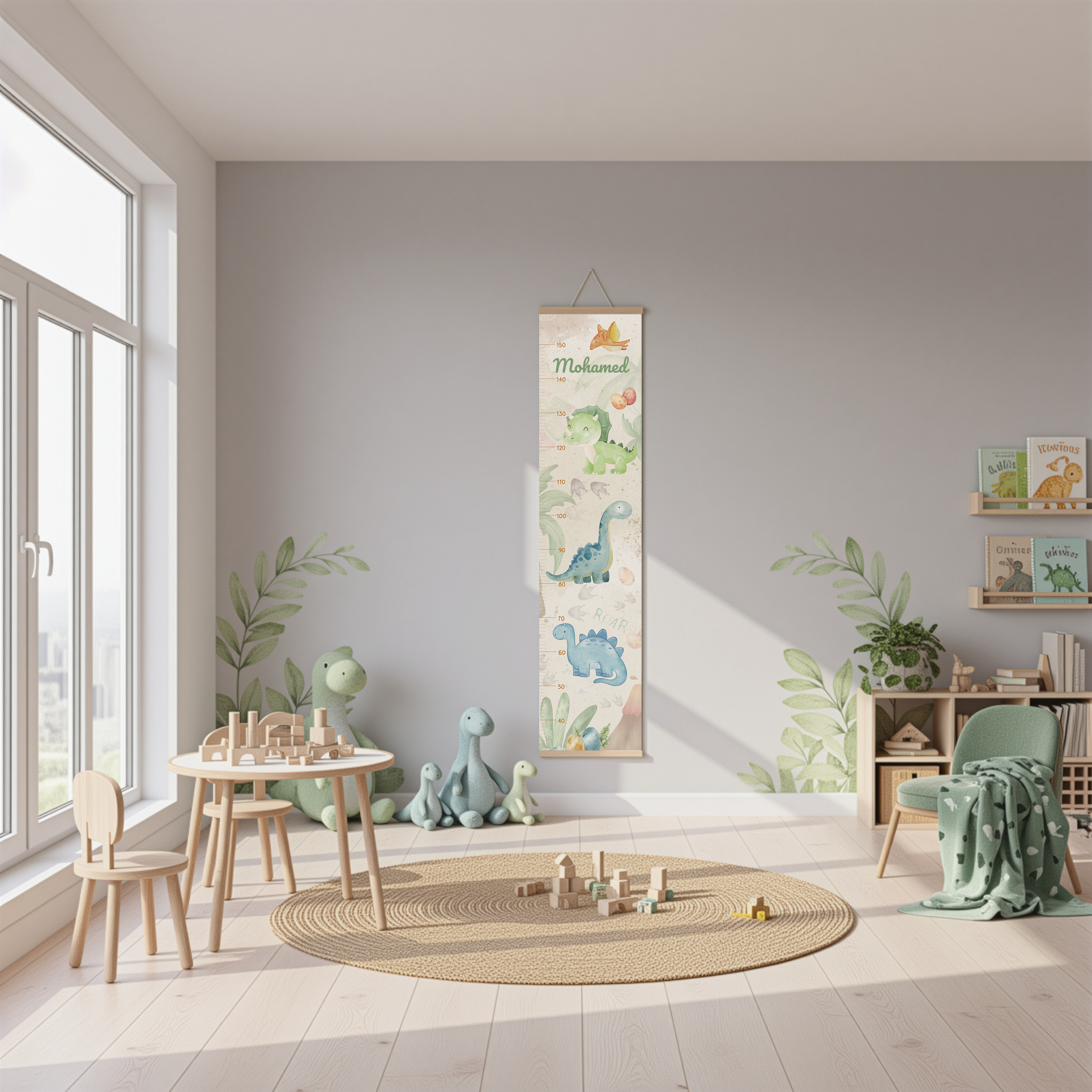 Embark on a prehistoric adventure with the Little Dino Explorers kids’ growth chart! Featuring friendly dinosaurs, leafy jungles, and playful footprints, this chart turns measuring your child’s height into an exciting expedition through a world of imagination. Every mark on the ruler becomes a milestone in your little explorer’s journey.